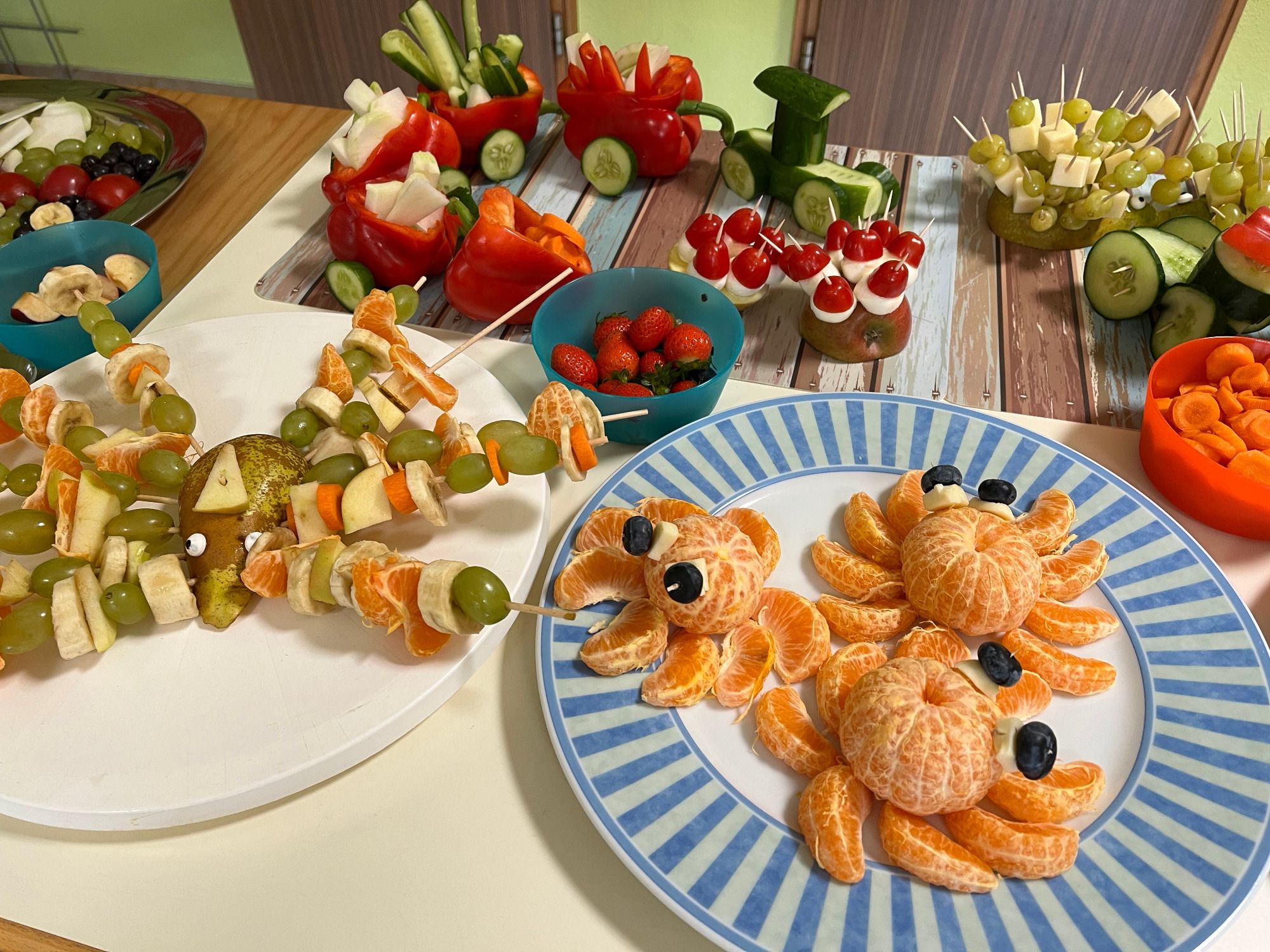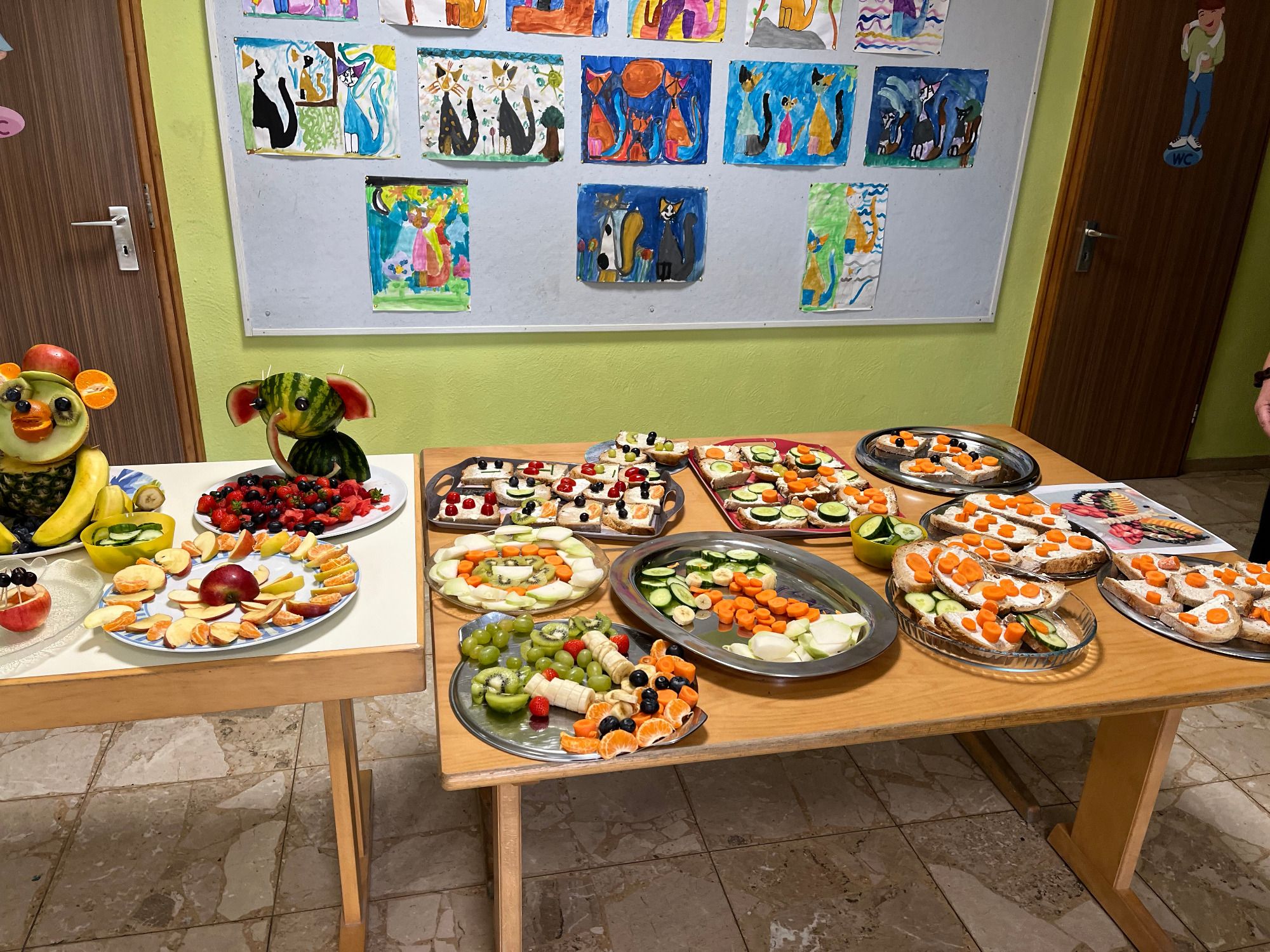 Die Mädchen und Jungen waren eifrig dabei, Gemüse und Obst zu schnippeln und fantasievoll auf Platten herzurichten. Anschließend trafen sich alle Kinder mit den Lehrerinnen und Betreuerinnen in der Aula, um gemeinsam die Leckereien zu bestaunen und natürlich aufzuessen.