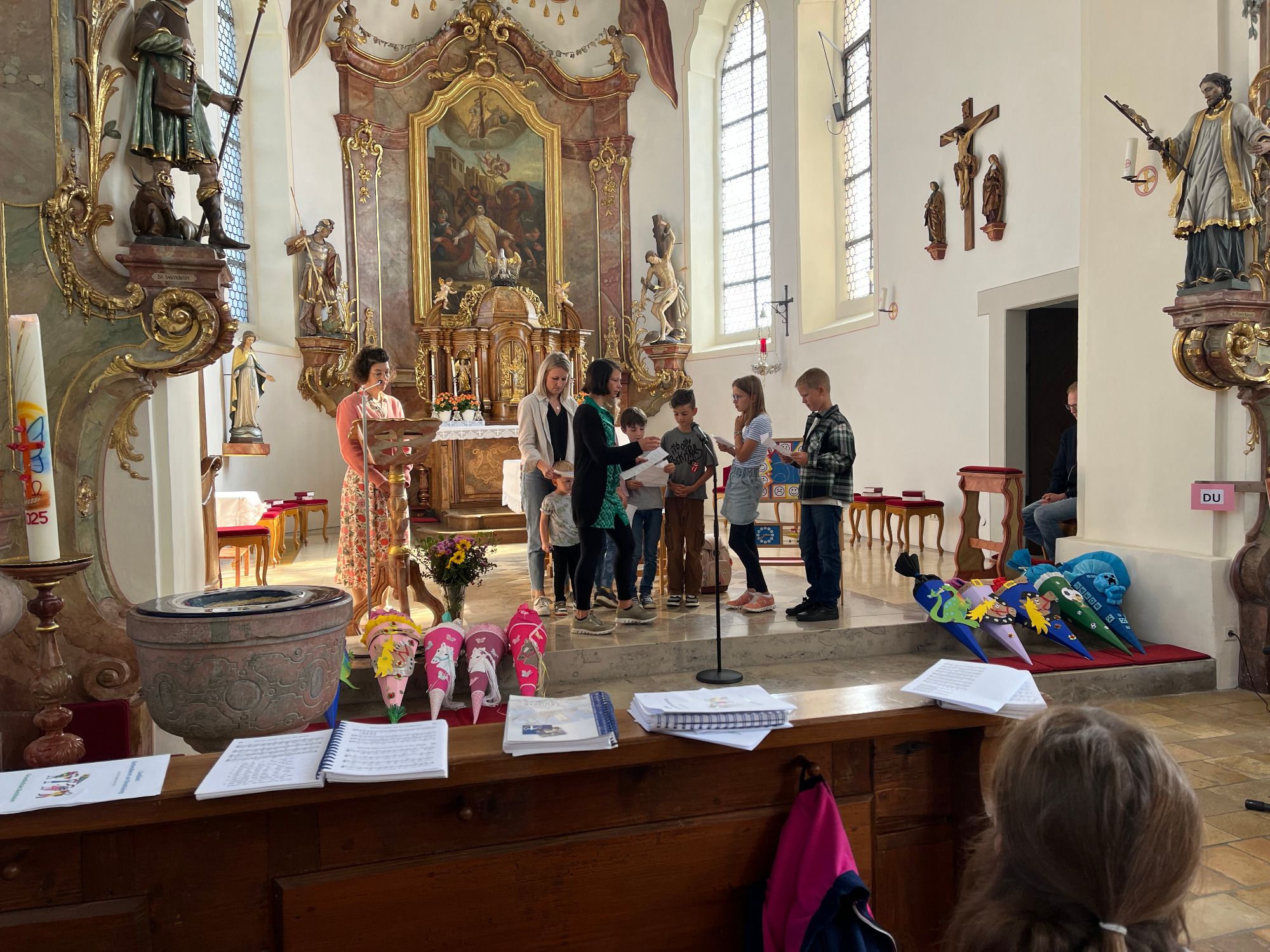 Pünktlich um zehn Uhr begann der feierliche Gottesdienst in der Kirche, der von Frau Marita Kohler, unter Mithilfe von Frau Daniela Knittel, liebevoll vorbereitet und durchgeführt worden war. Im Mittelpunkt stand eine Geschichte aus der Kinderbibel, die beschrieb, wie wichtig Jesus die Kinder waren und sind: Dass man das Leben mit ihren Augen betrachten solle, da sie offen seien und die Älteren in dieser Hinsicht von ihnen lernen könnten. --- Die älteren Grundschulkinder trugen hierzu Fürbitten vor, und je eine Vertrauensperson sollte ein Erstklässlerkind im Kreis um den Altar herum unterstützen und ihm beistehen.